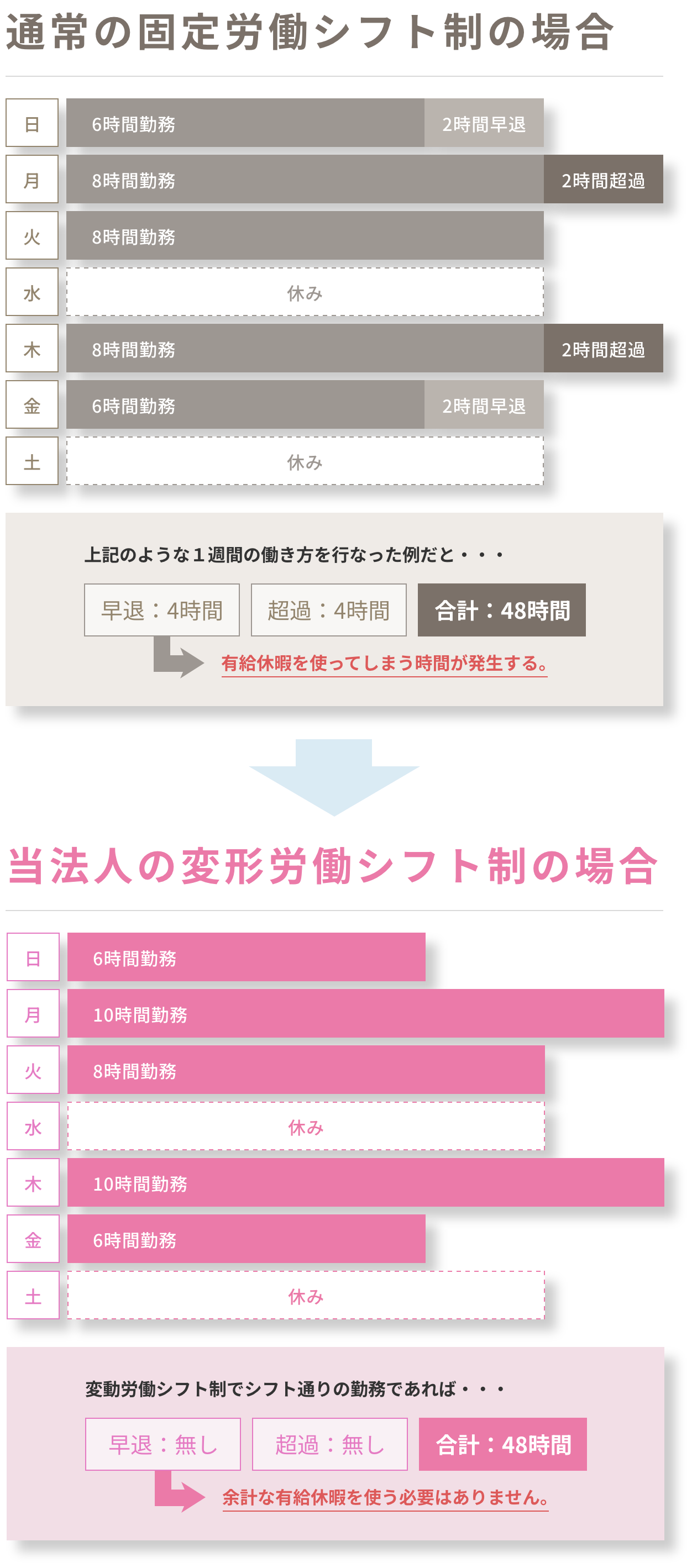 当法人では、多くの医療機関が採用している「固定労働シフト制」ではなく、「変形労働シフト制」を導入しています。スタッフ一人ひとりの生活スタイルに合わせて、長く働く日や短く働く日を柔軟に設定することが可能です。