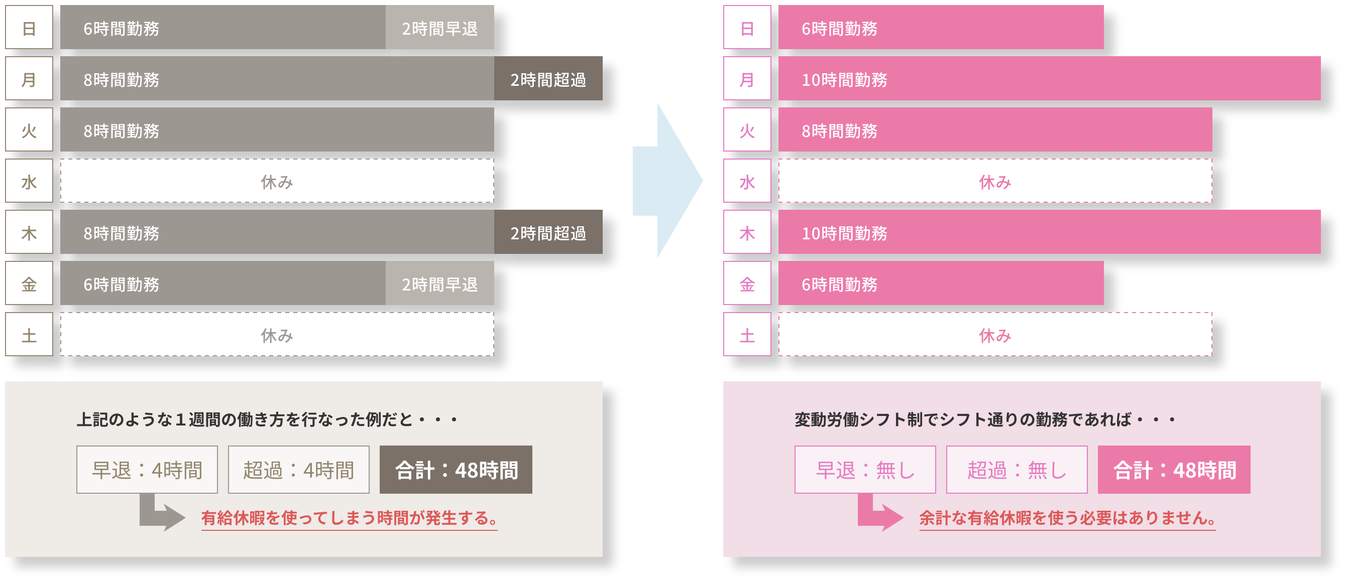 当法人では、多くの医療機関が採用している「固定労働シフト制」ではなく、「変形労働シフト制」を導入しています。スタッフ一人ひとりの生活スタイルに合わせて、長く働く日や短く働く日を柔軟に設定することが可能です。